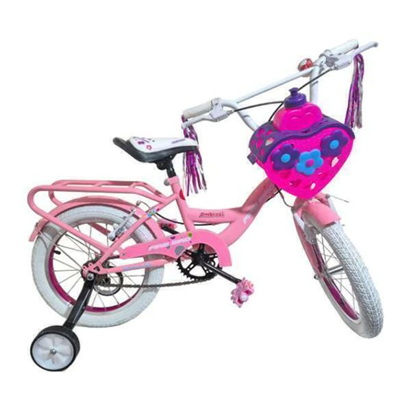 - Cuadro: Acero rodado 16" Dama, formato curvo. - Portaequipaje: soldado al cuadro. - Cámaras: válvula de auto vulcanizadas. - Llantas: de aluminio. - Frenos: V-Brake trasero y delantero. - Cubiertas: blancas. - Asiento: con estampado. - Canasto: plástico con caramagnola corazón o tejido con flores. - Accesorios: Incluye timbre y flecos, estabilizadores, cubrecadena y guardabarros al tono.